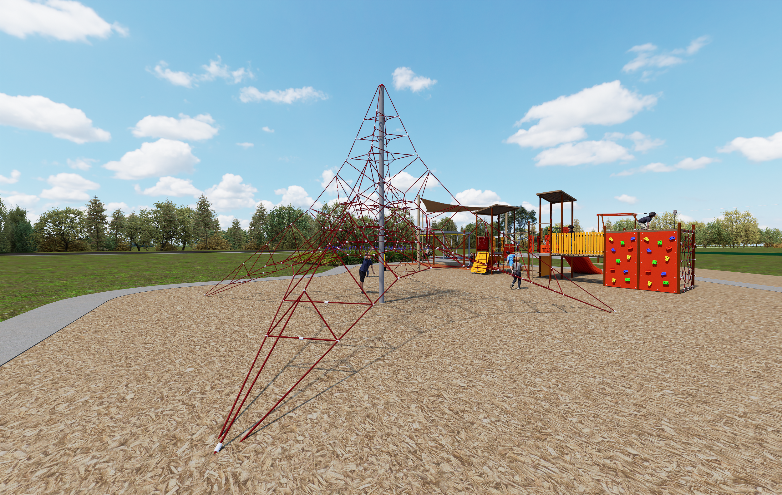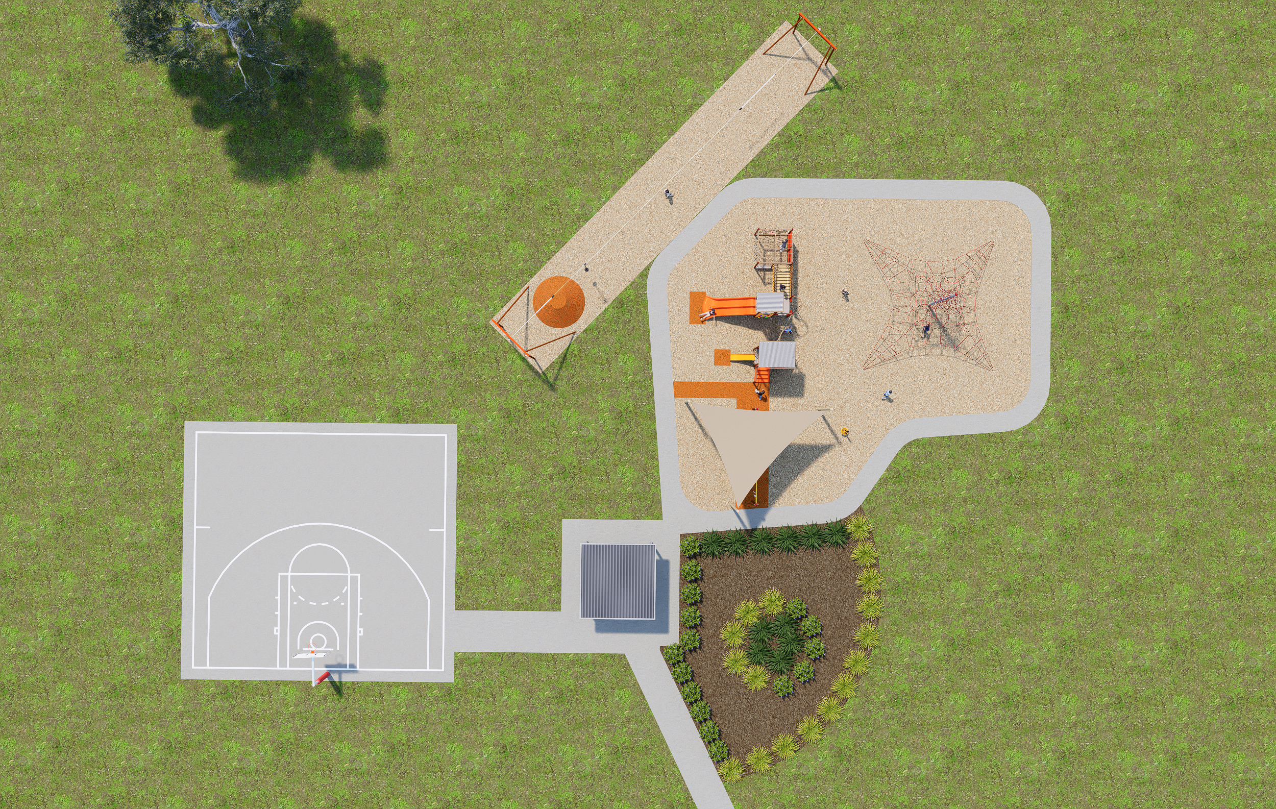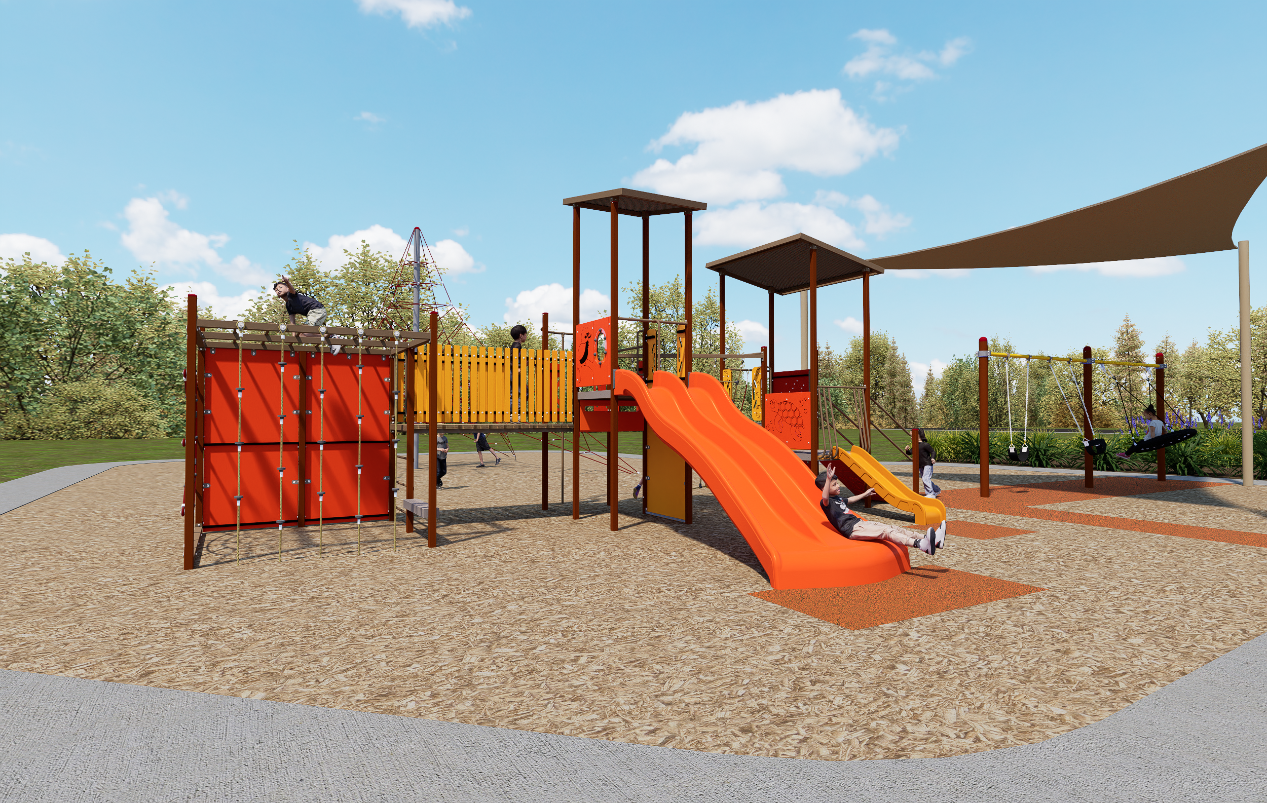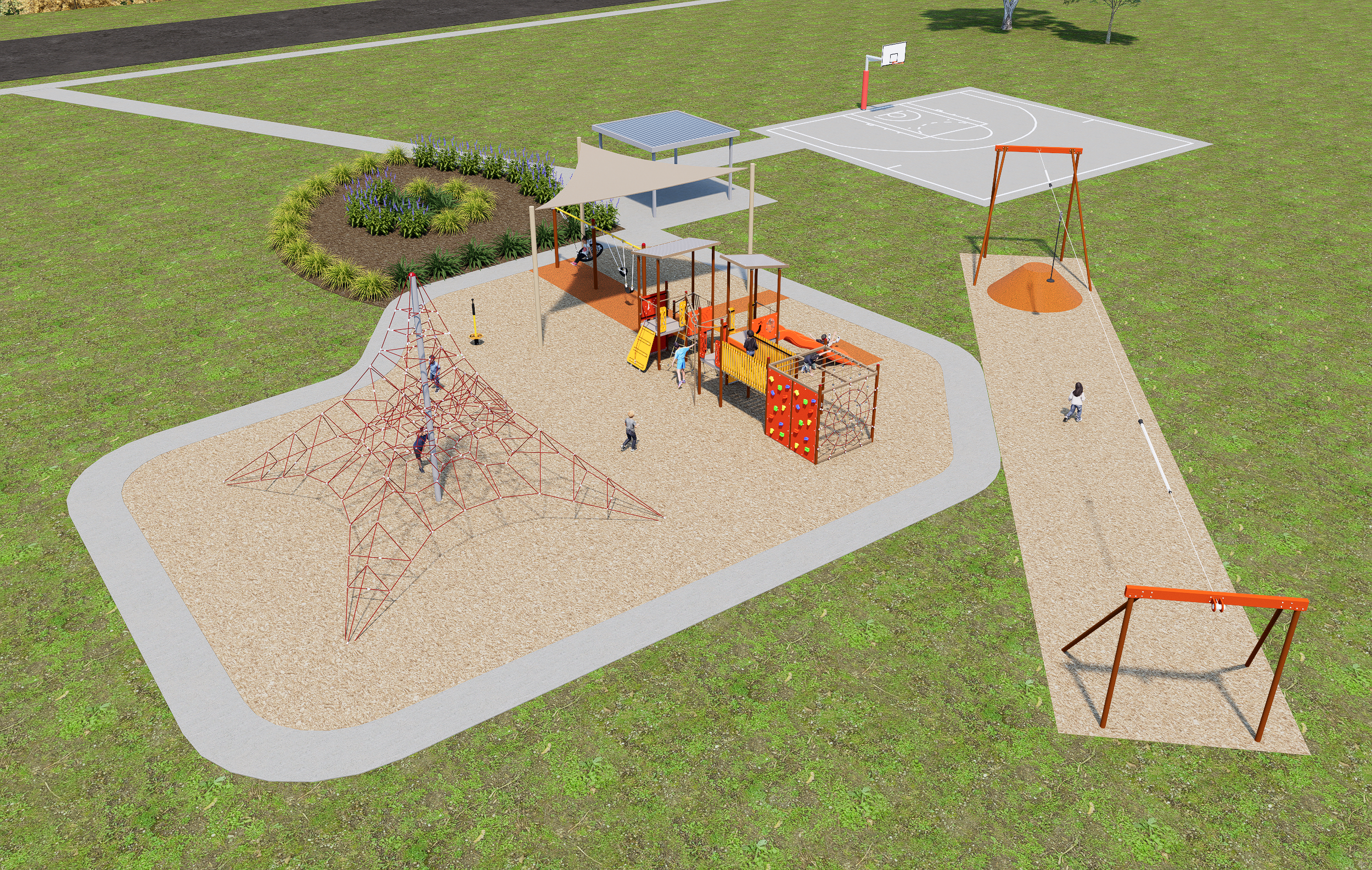 The new play space is designed to a neighbourhood level, catering to a wide range of age groups, from pre-schoolers through to secondary school students. It will be medium to large in size, with between five and ten play features. The design also includes a shelter, seating, low maintenance mulched garden beds (future stage) and access path.
