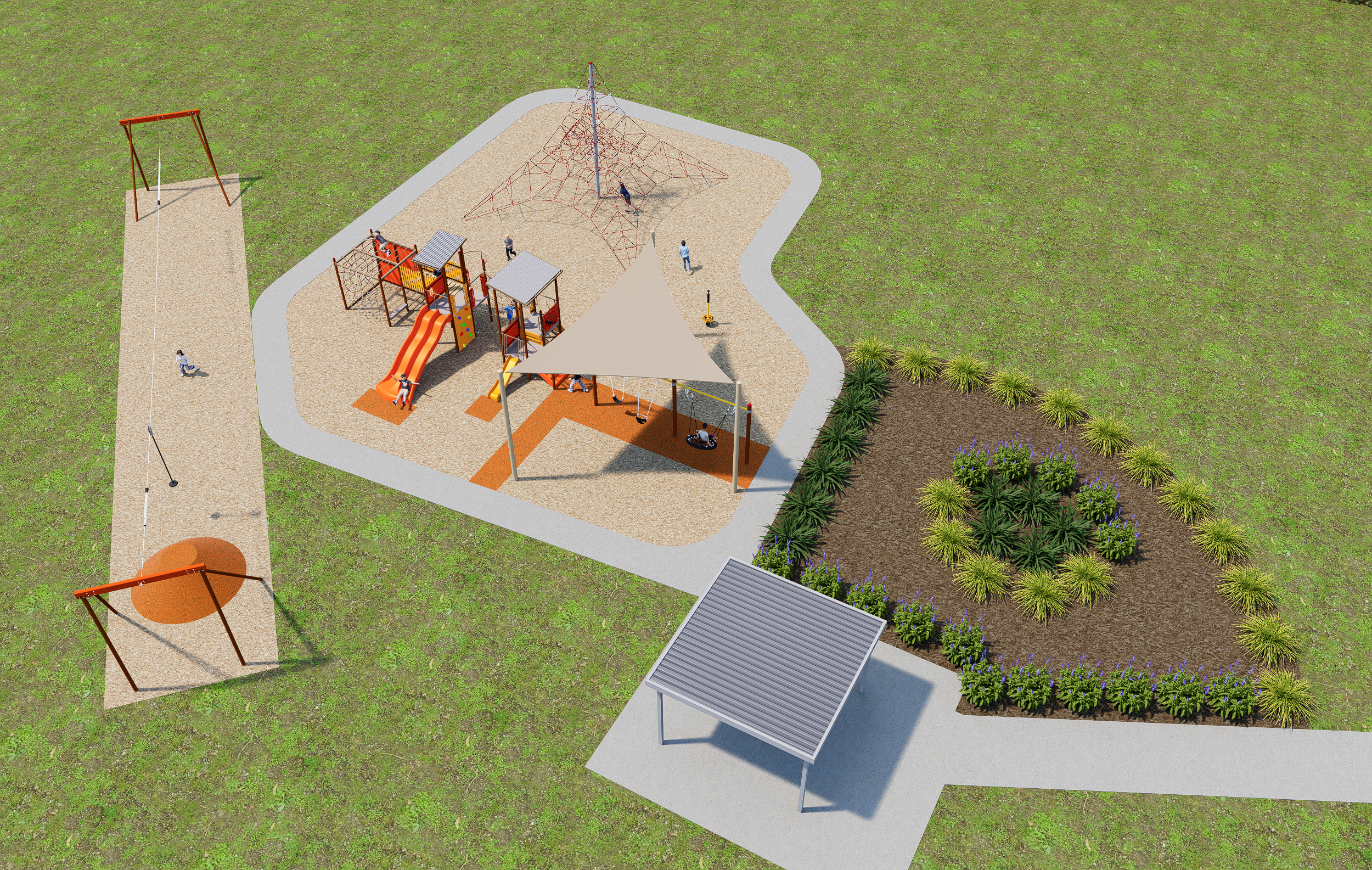 Other features of the space will include path access to play via a shelter and seating to provide a space for carers. Partial shade is proposed over play and future works will include landscaping.