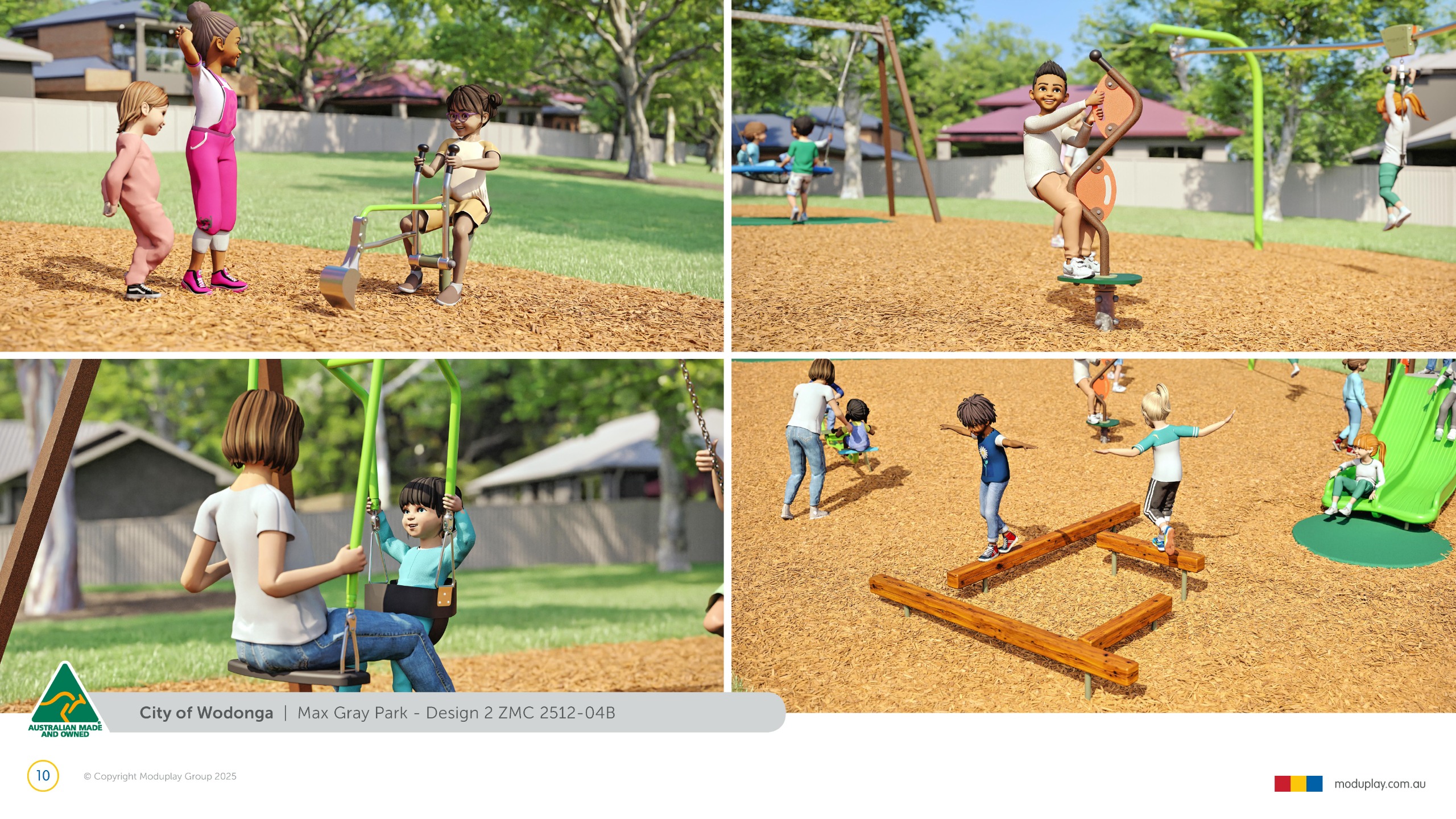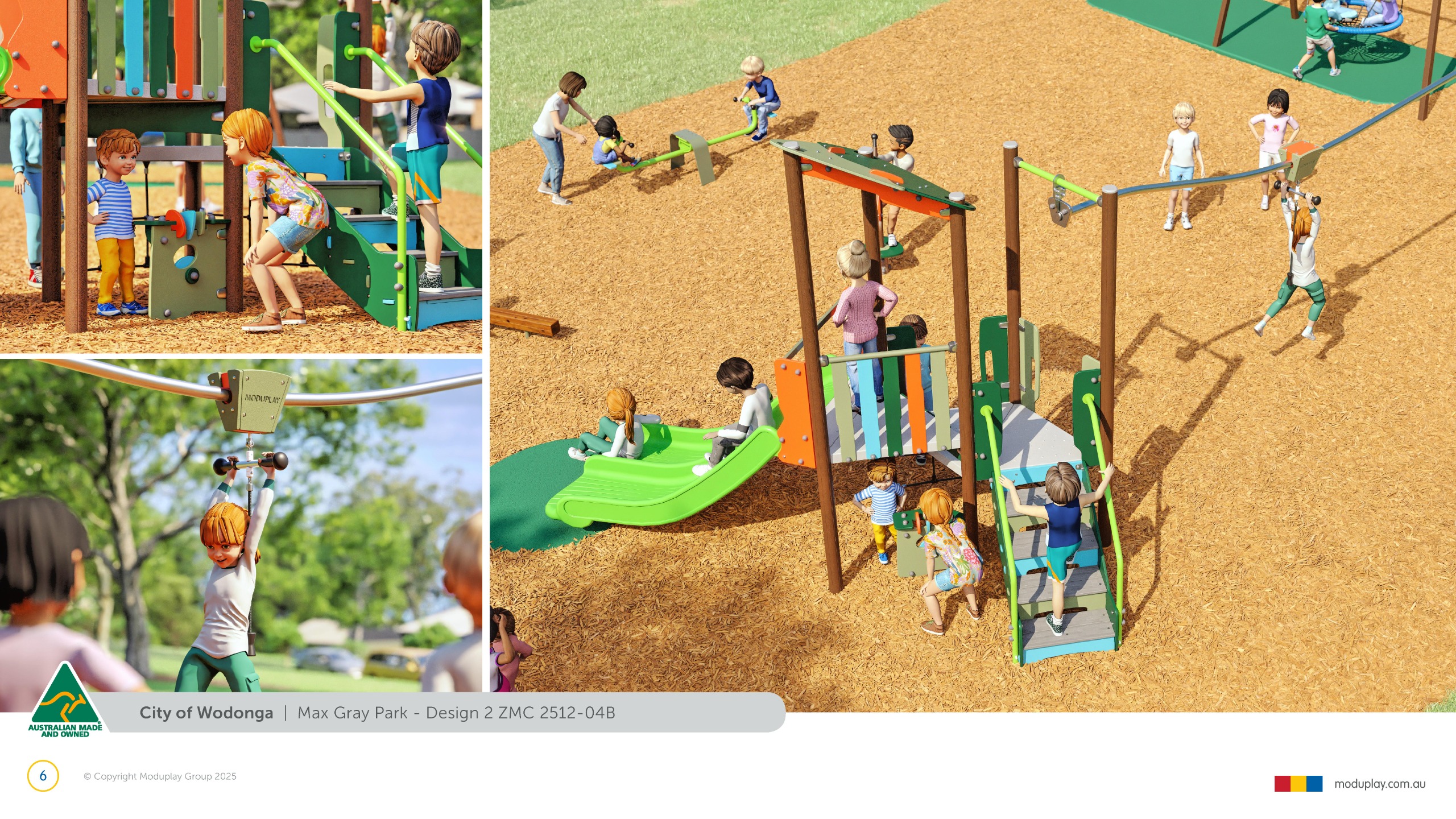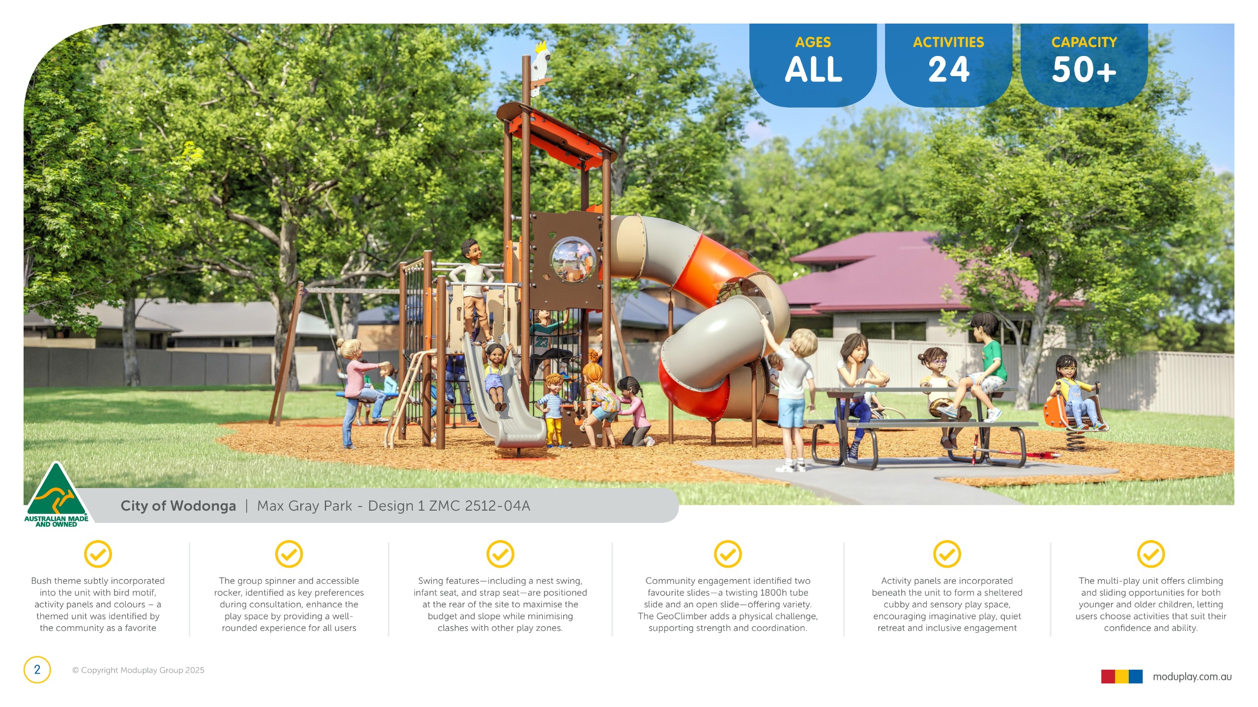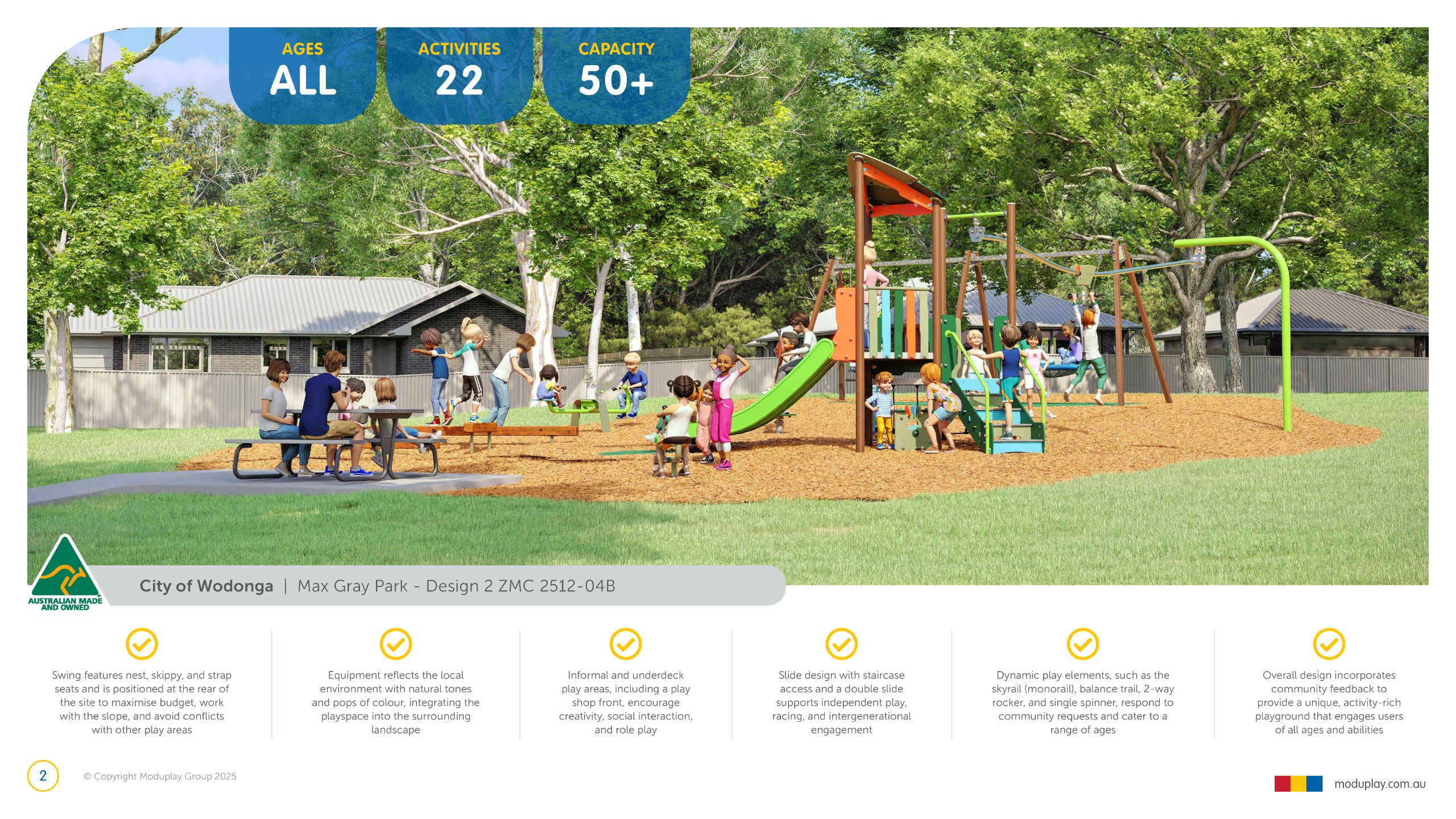 Design 2 brings together many of the community’s most requested features in one energetic and social playground, including a monorail, double slide, the most popular swing seats, rocker and spinner elements. Stair access, balance play and under-deck role-play spaces reflect feedback for accessible, imaginative and active play options that cater for a wide range of ages and abilities.