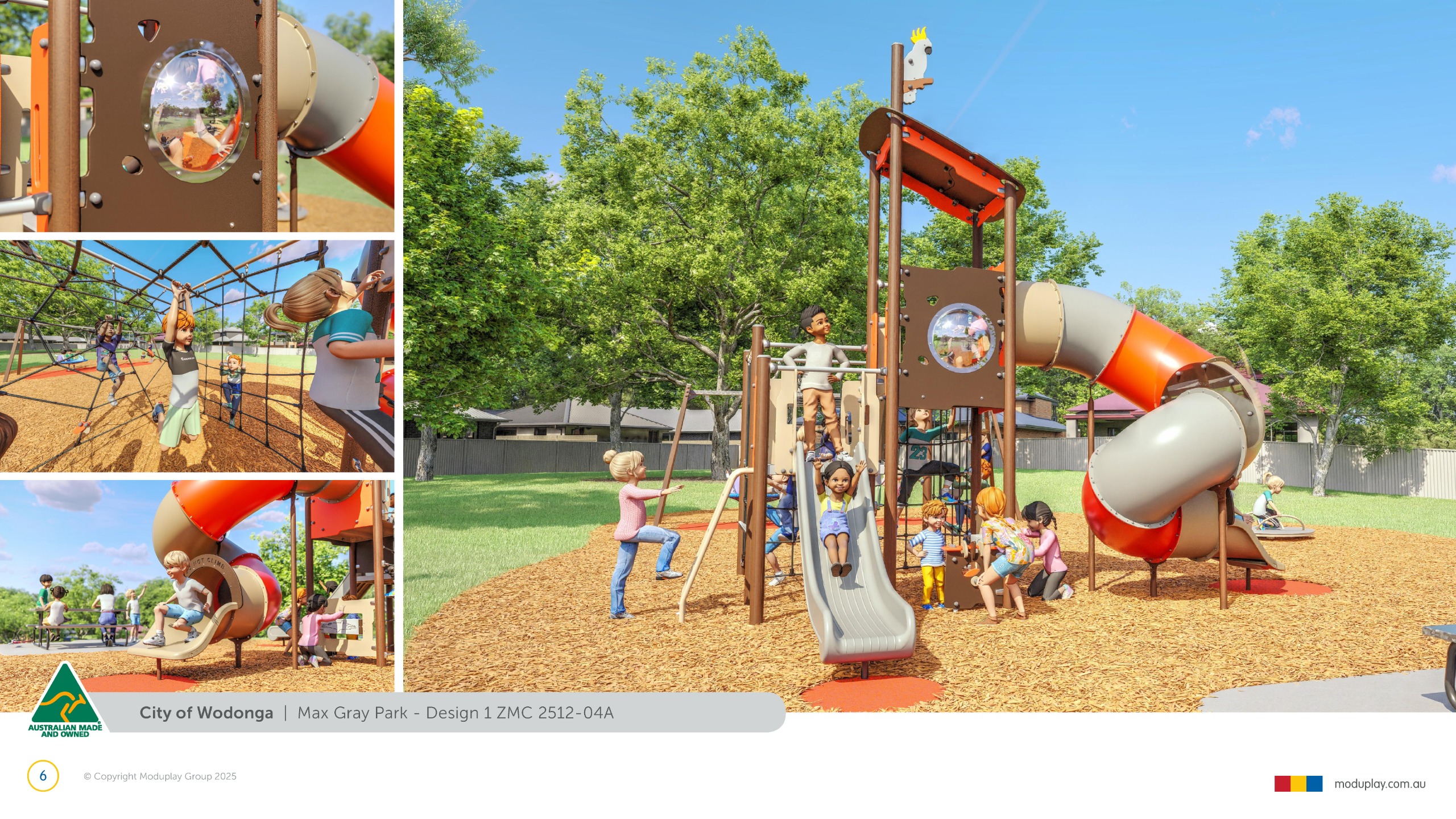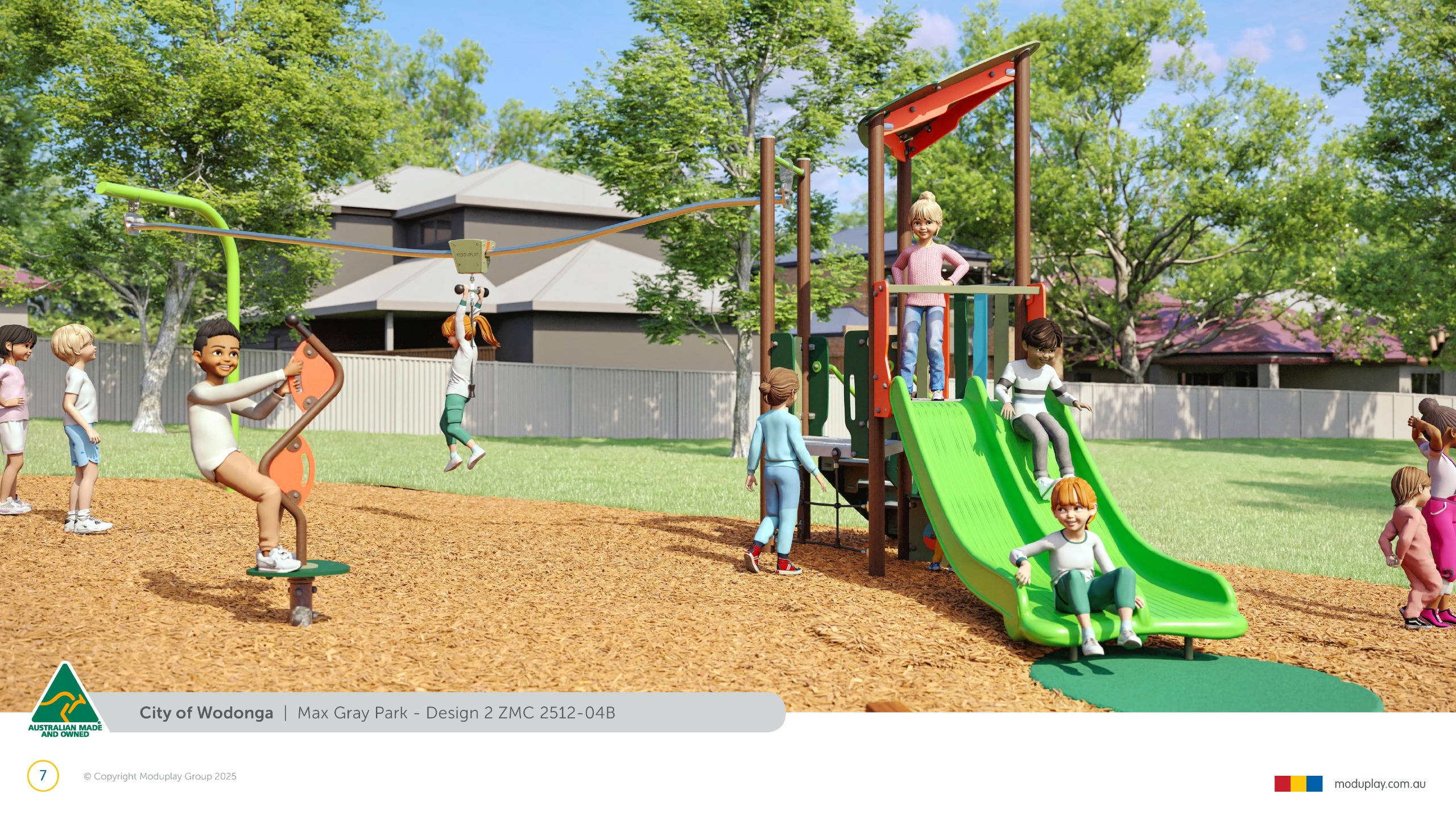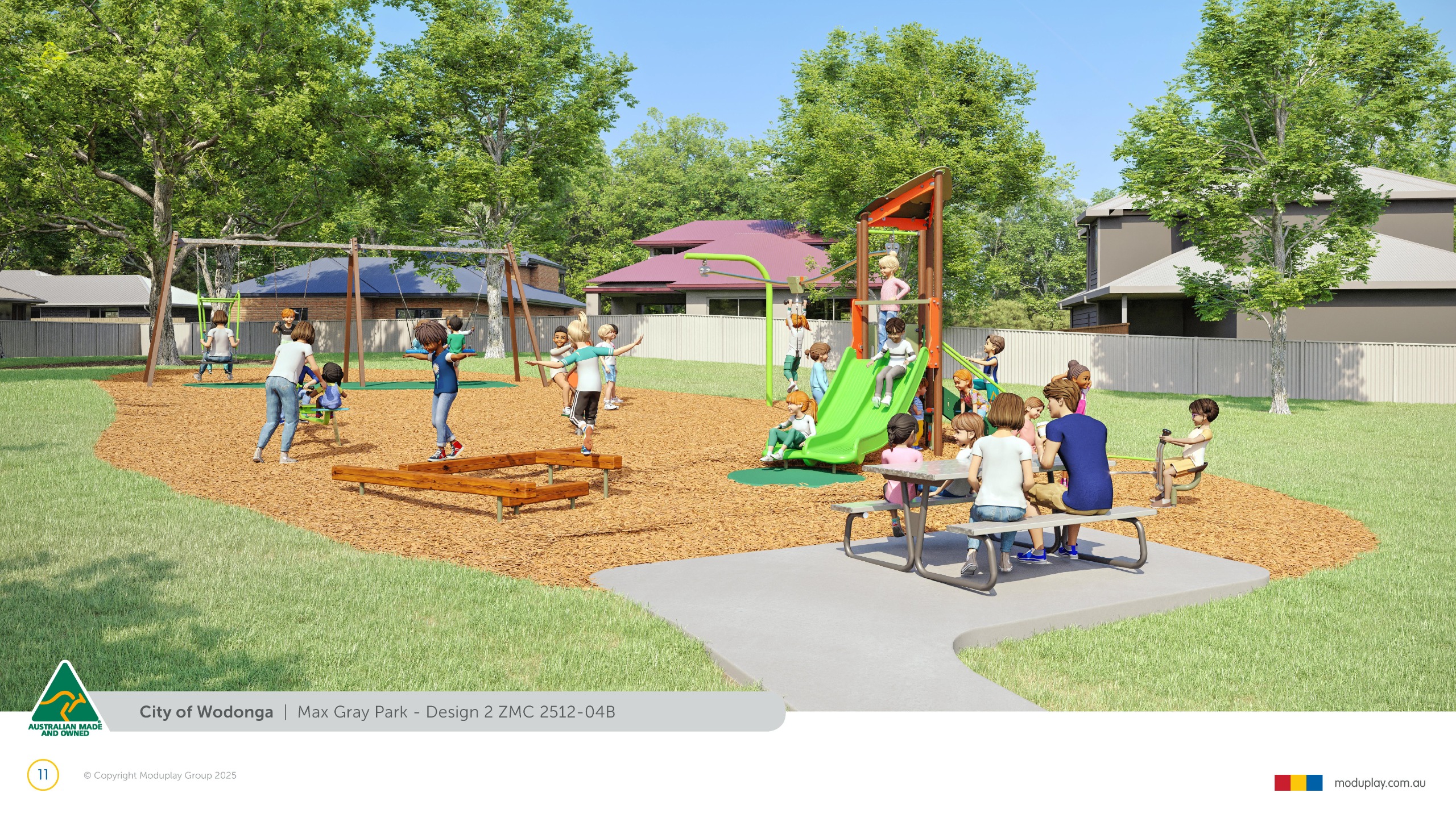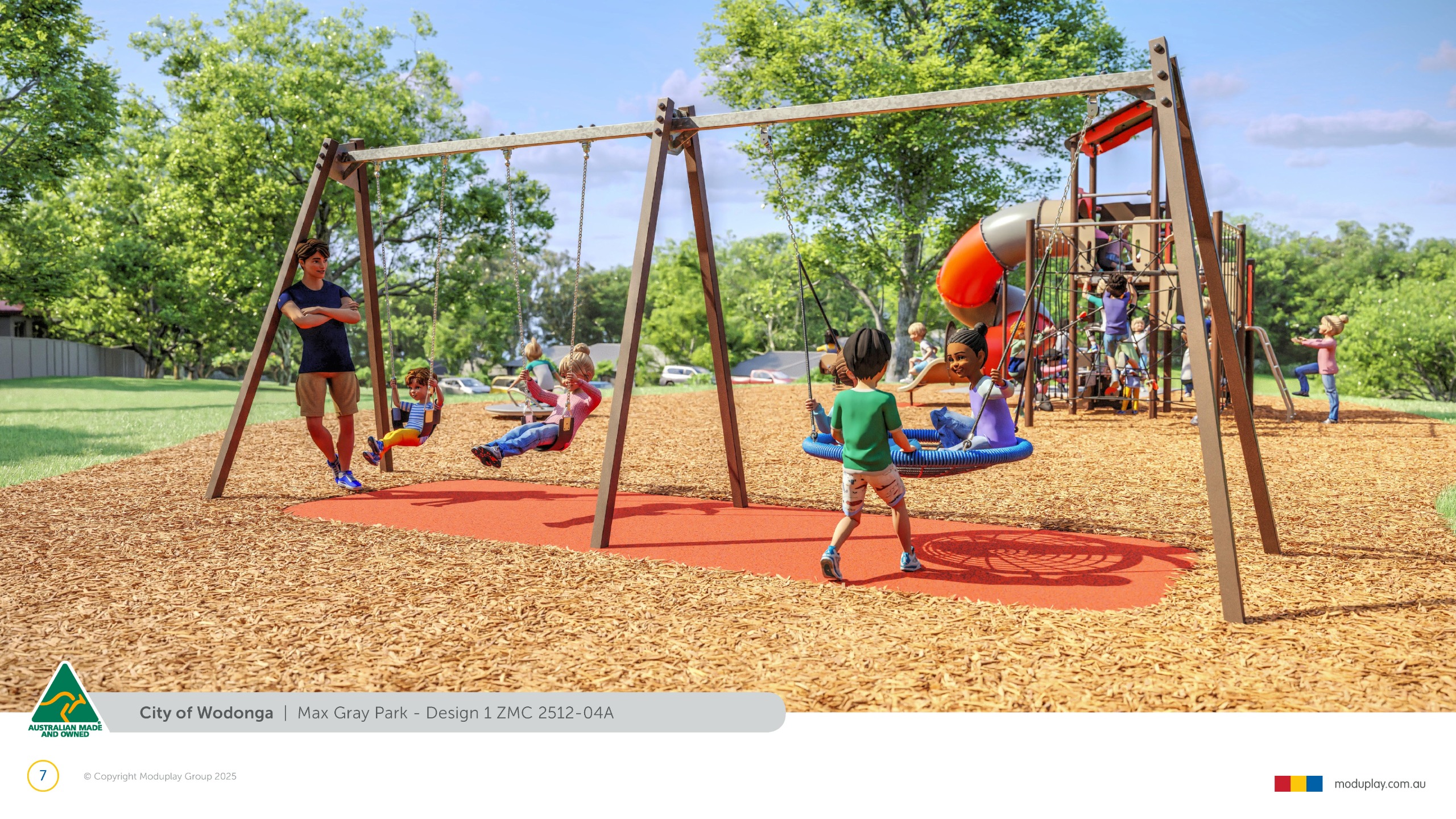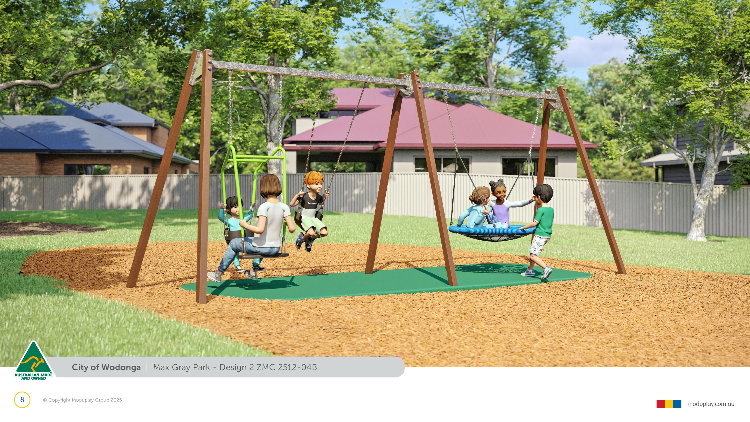 Design 2 brings together many of the community’s most requested features in one energetic and social playground, including a monorail, double slide, the most popular swing seats, rocker and spinner elements. Stair access, balance play and under-deck role-play spaces reflect feedback for accessible, imaginative and active play options that cater for a wide range of ages and abilities.