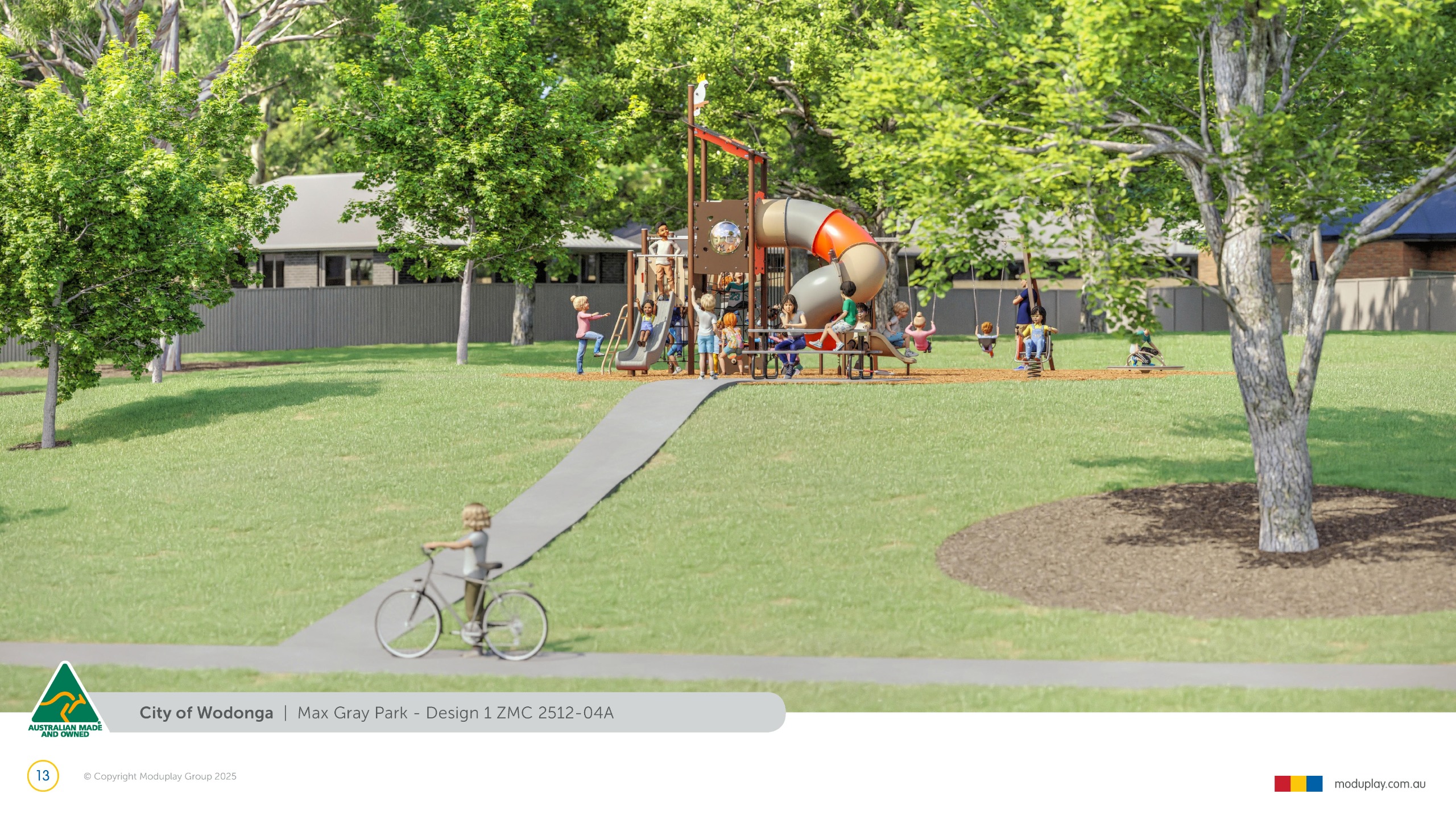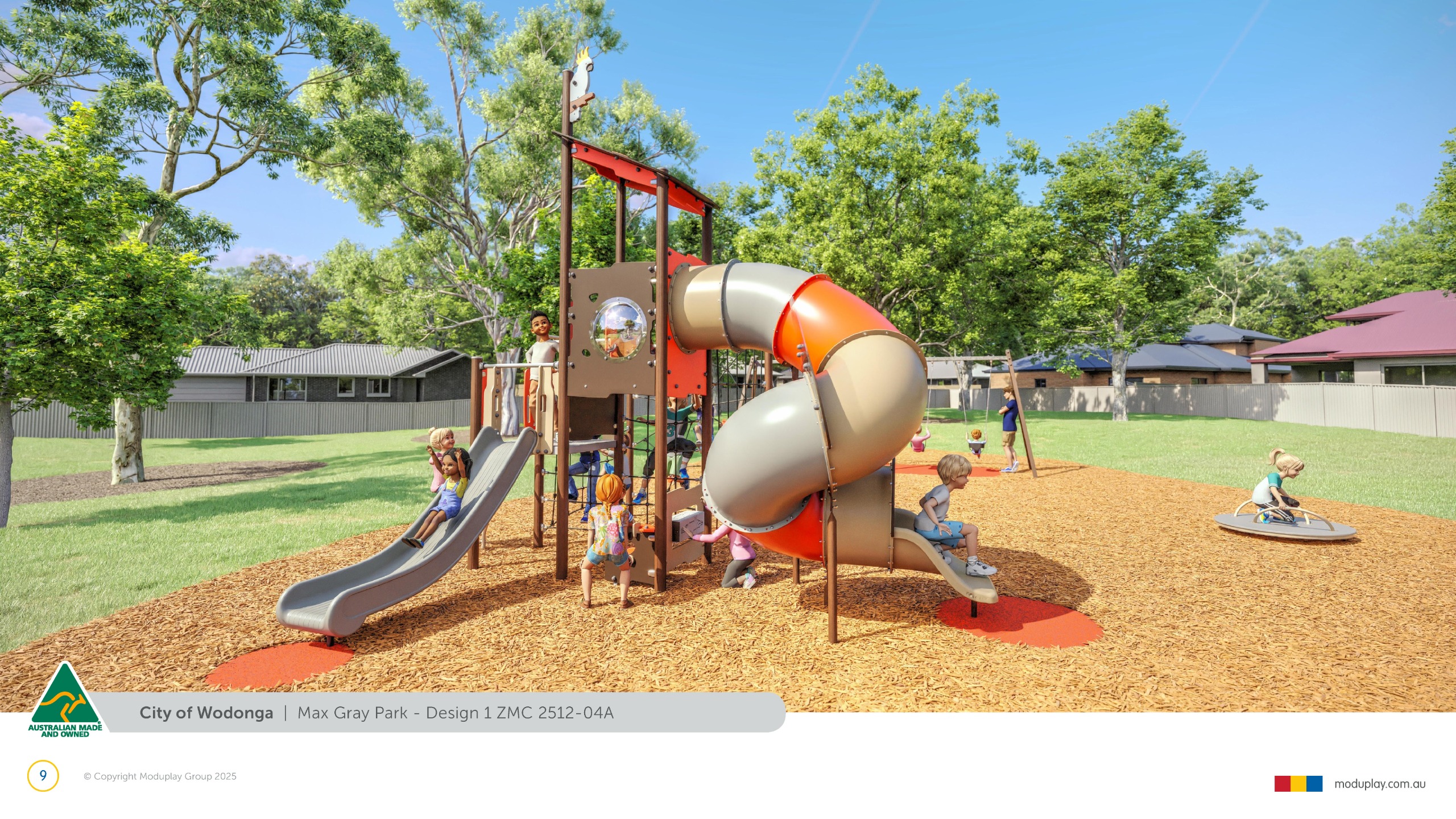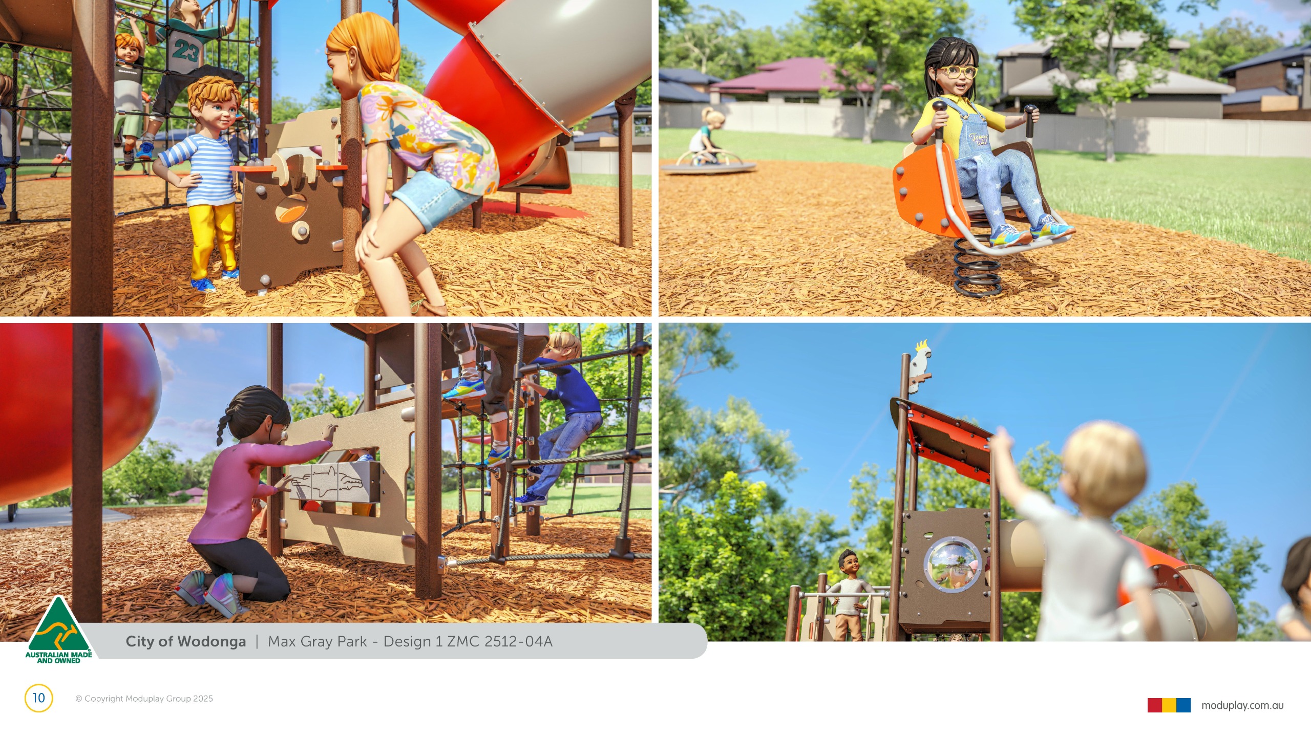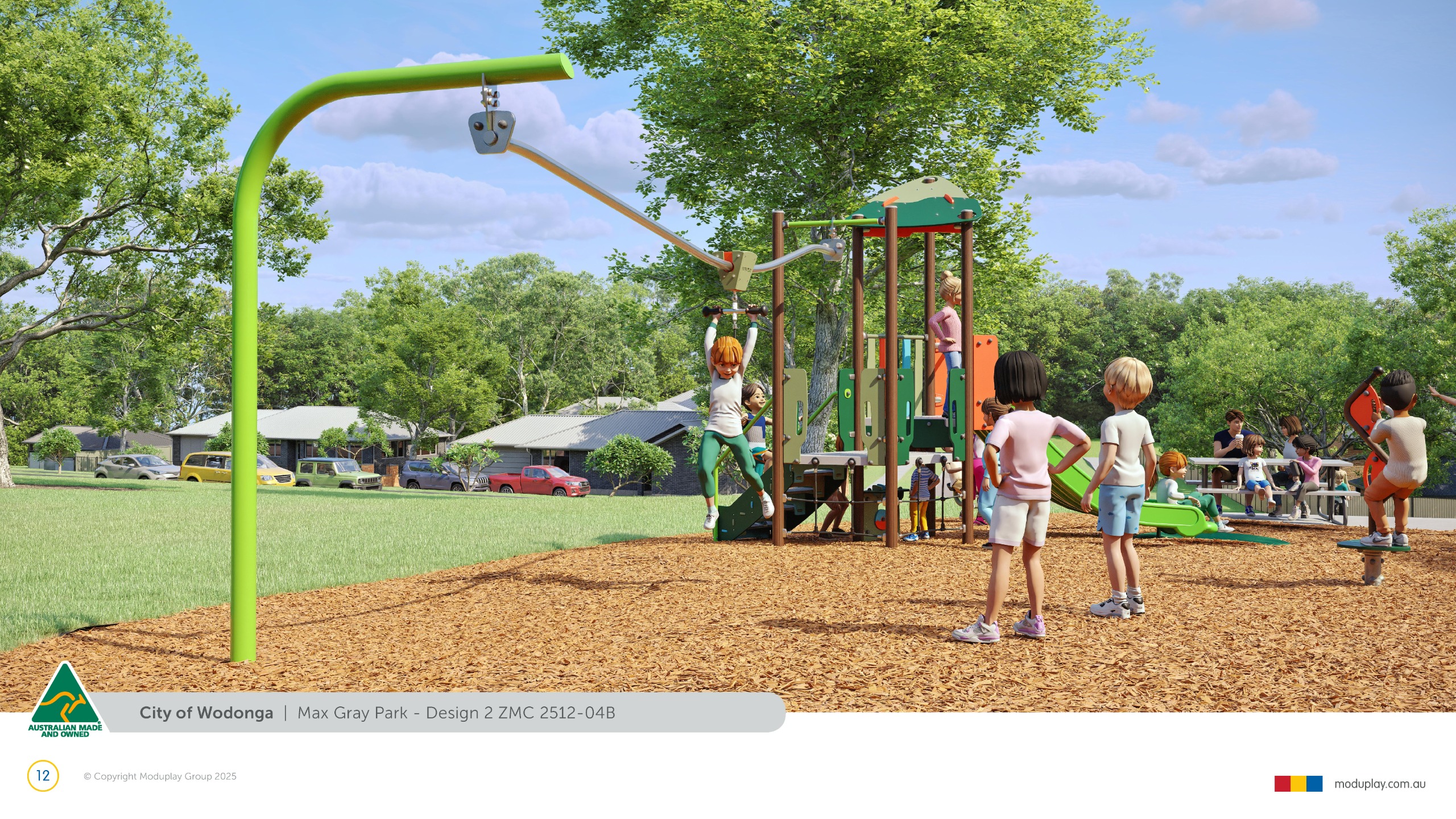 Design 2 brings together many of the community’s most requested features in one energetic and social playground, including a monorail, double slide, the most popular swing seats, rocker and spinner elements. Stair access, balance play and under-deck role-play spaces reflect feedback for accessible, imaginative and active play options that cater for a wide range of ages and abilities.