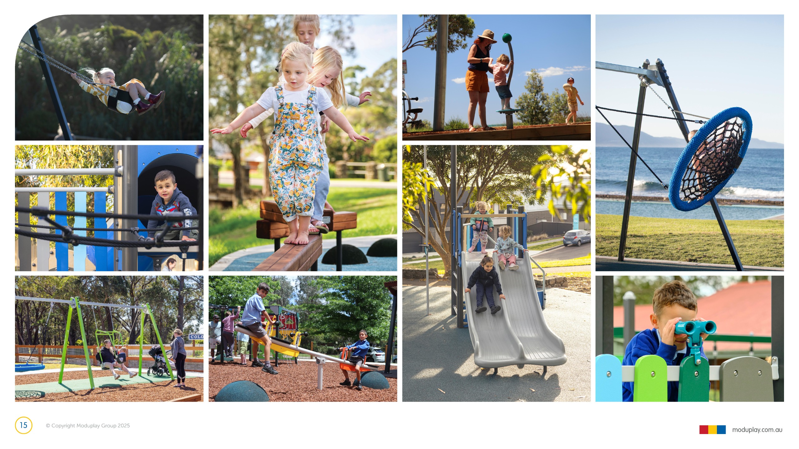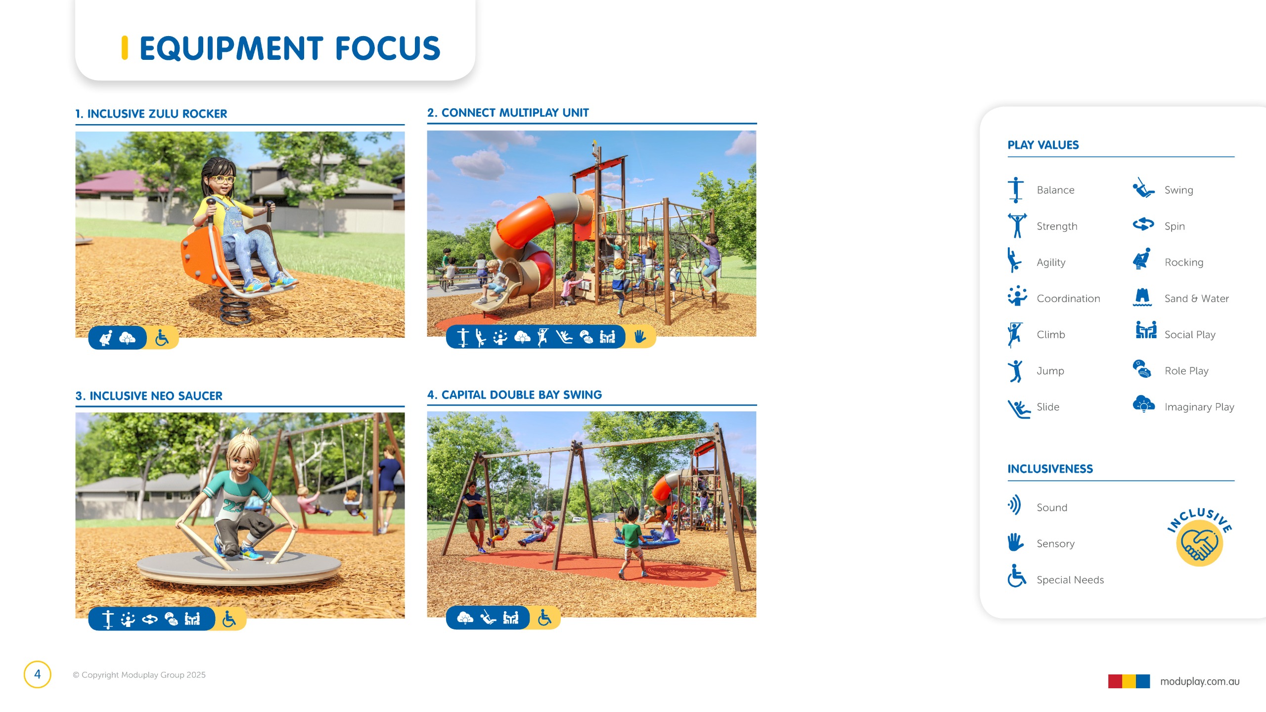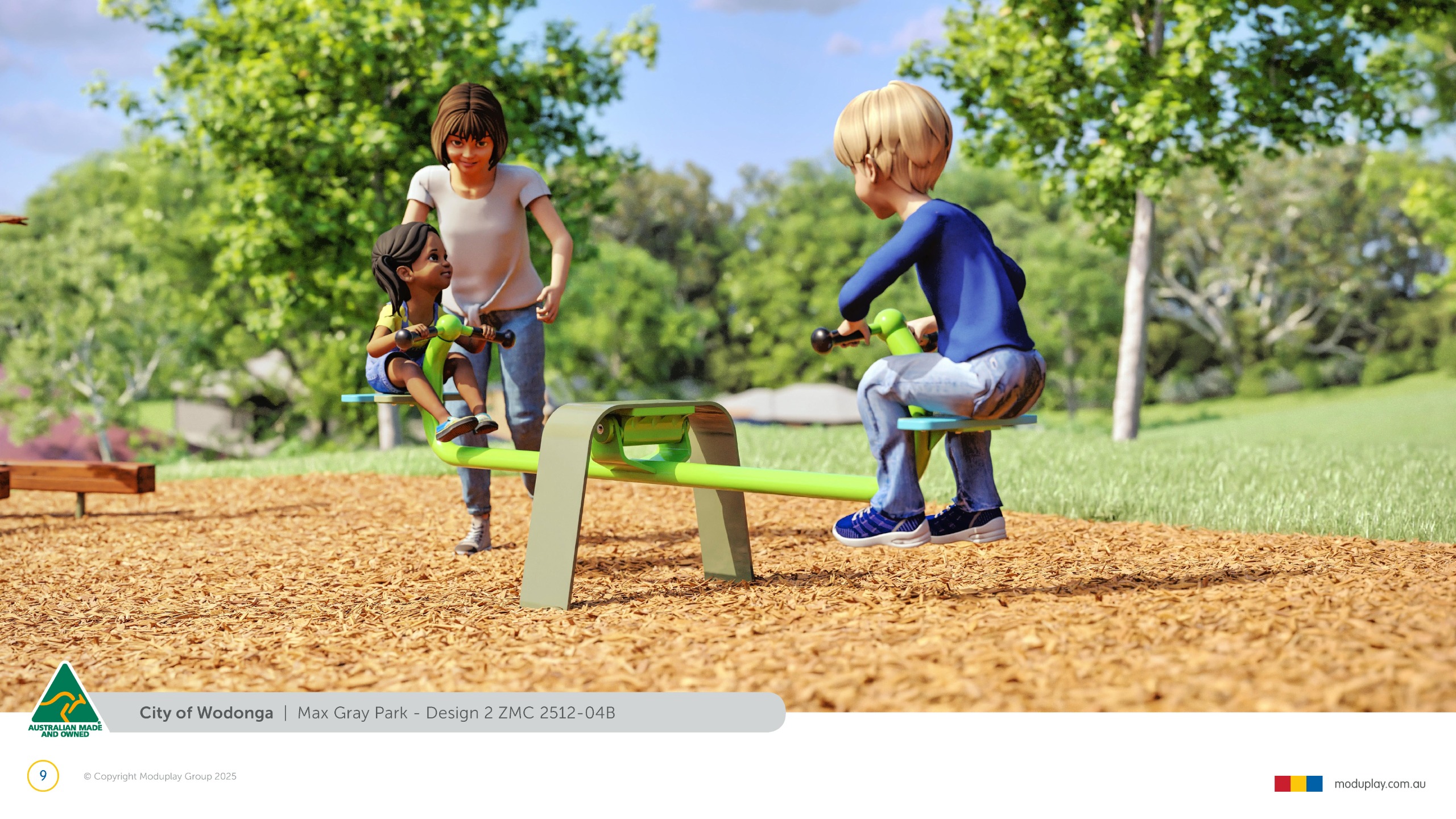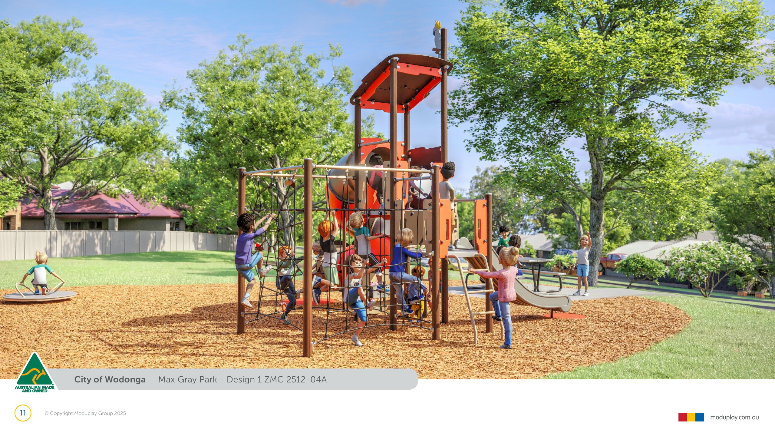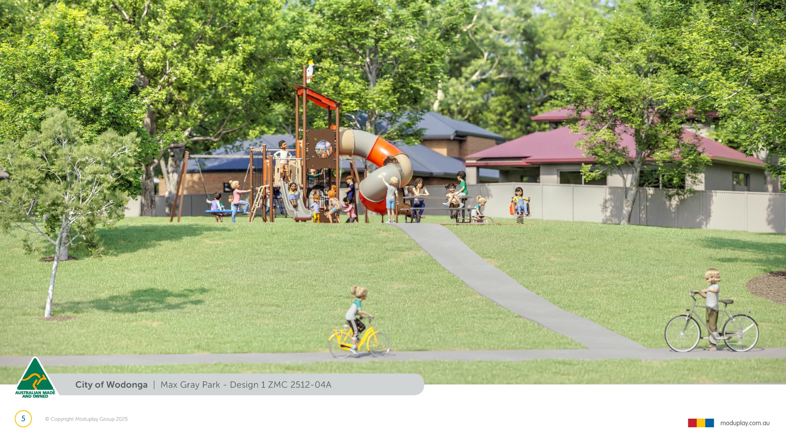 Design 2 brings together many of the community’s most requested features in one energetic and social playground, including a monorail, double slide, the most popular swing seats, rocker and spinner elements. Stair access, balance play and under-deck role-play spaces reflect feedback for accessible, imaginative and active play options that cater for a wide range of ages and abilities.