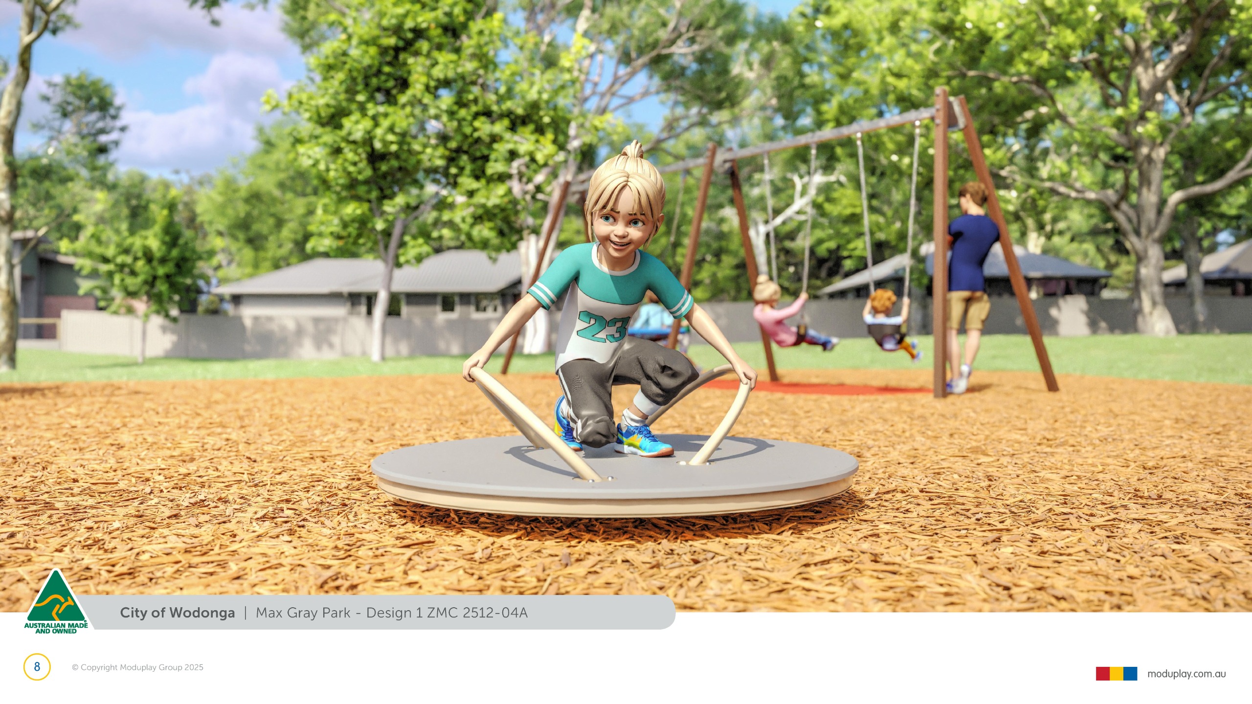 Design 1 responds directly to what the community told us they wanted most, including a variety of swings, two slides, a group spinner and an accessible rocker. Feedback supporting themed play, cubby spaces and role-play has been incorporated through native theming, activity panels and a shopfront integrated within the play structure, creating an inclusive playground that offers something for younger children, older kids and carers to enjoy together.
